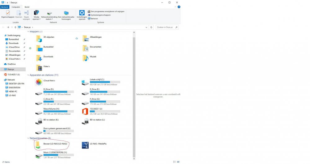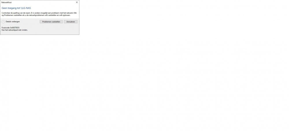 Probleem met externe schijven (usb)beukenootje reageerde op beukenootje's topic in Archief Windows 10 Heb nu een Netwerklocatie toegevoegd Daar moest ik een map op de netwerklocatie selecteren Dit heb ik gedaan, nu heb ik in de verkenner bij Netwerk Locaties een map er bij gekregen, en als ik daar op klik gaat die map op de LG-NAS open Als ik nu bij Netwerk op de LG-NAS klik gaat ook deze gewoon open en zie ik daar alle mappen die op de LG-NAS staan. Dit wou eerst niet, terwijl de SMB1/CIFS gewoon aangevinkt staan, nu met die Netwerk Locatie erbij wil dit wel. ook na het opnieuw opstarten van de PC. Zal straks die vinkjes even weghalen en zien of het dan nog werkt.
