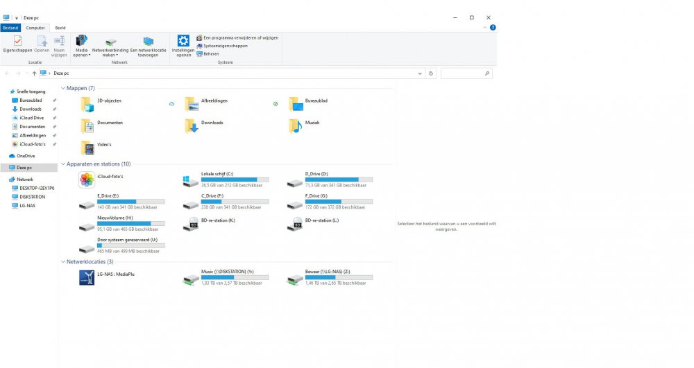 Probleem met externe schijven (usb)beukenootje reageerde op beukenootje's topic in Archief Windows 10 Sorry voor de Quotes, Mijn nas zit rechtreeks aan de router met de netwerkkabel Deze is op andere PC's of apparaten gewoon te benaderen Ik heb daar wel een wachtwoord voor ingesteld Ik heb een MAP van de nas als schijf in de verkenner dit is schijf Z Er zit ook nog een 2de Nas in het netwerk een Synology, deze werkt wel gewoon Momenteel werkt de LG-NAS weer maar het kan zo zijn dat als ik morgen de PC weer aanzet dat hij weer onbenaderbaar is De Z-drive staat dan met een rood kruis in de verkenner bij netwerken staat de LG-NAS gewoon onder de Synology maar als ik er op klik duurt het even en dan krijg ik de melding dat ik geen toegang heb. Ik heb het netwerk ingesteld als Openbaar en heb ook overal dezelfde netwerk naam staan. Ik heb op internet gelezen dat het met SMB 1.0/CIFS te maken heeft, Windows 10 zou de oudere niet meer ondersteunen. Dit kun je dus in Windows Onderdelen in of uitschakelen verhelpen, daar moet je SMB 1.0/CIFS alles aanvinken. En dan werkt het ook weer, tot de computer opnieuw word opgestart, dan kan het zo zijn dat hij weer weg is, dan haal ik de vinkjes er weer uit start de computer opnieuw op dan de vinkjes er weer in, en dan werkt het ook weer. En dat is alleen op deze PC na die laatste Windows update of inmiddels de 1 na laatste want de laatste was van die drivers. Voor die tijd heb ik 1x die vinkjes er in gezet en toen bleef het gewoon werken, tot die bewuste update dus. De Nassen staan hier altijd aan ook 's nachts. Bijgaand een schermafdruk van de verkenner.