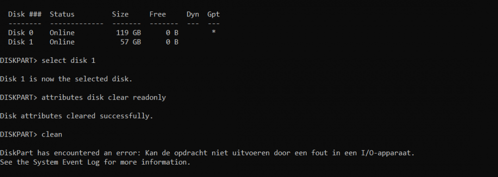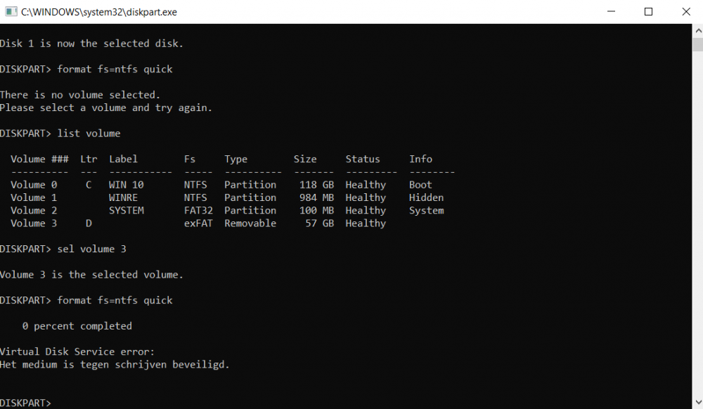 Dit krijg ik bij de eerste manier en de tweede had ik al gedaan en dan krijg ik een venstertje met de melding schijf tegen schrijven beveiligd. -