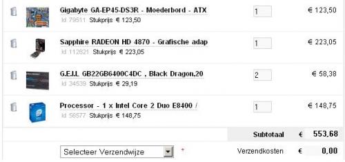 ik zou de gedachten maar uit je hoofd zetten dat alles op de beurzen goedkoper is, want dat is al jaren niet meer zo ik ben zelf vorige week nog naar de HME (hcc) beurs geweest.. en alles was net zo duur of duurder dan dat je online kan krijgen. met andere woorden, online kopen is goedkoper! nee, dit betekent dat er van dit type geheugen aanwezig is op de kaart zelf.je kan dus gewoon ddr2 op je moederbord zelf prikken. nee, je kan gewoon het geluid van je moederbord gebruiken zelfs, dit geeft vaak al meer dan goede kwaliteit!een geluidskaart is natuurlijk wel een optie als je er een geluidsinstallatie achter hebt hangen waar je U tegen zegt.. of als je erg veel met audio bezig bent. ik stel ongeveer het volgende voor. (zie bijlage) dit heeft een kwalitatief erg goed bord! goed aantal aansluitingen en goede flexibiliteit. 4x 1gb werkgeheugen er op (ddr2) een C2D E8400 voor goede prestaties (een quadcore heb je weinig aan bij games, laten we zeggen bijna niets) een dikke ati 4870 voor uitermate goede game prestaties (die boven die van de 9800 rijken!) -