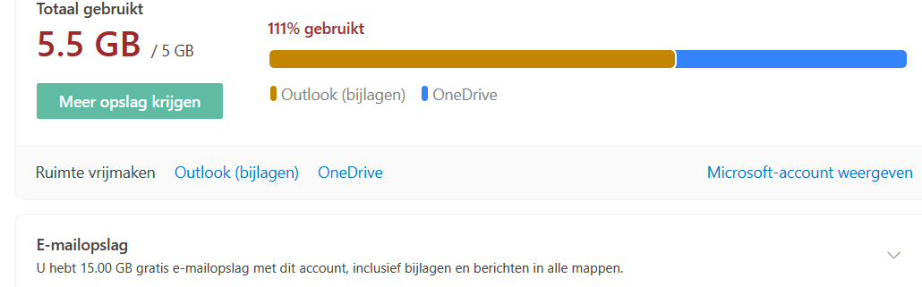 Goeie morgen iedereen.. Daarnet kreeg ik op mijn Outlook.com een berichtje dat ik vanaf 1 februari (ook in tijd ๐ ) meer opslagruimte nodig heb om mijn e-mail te verzenden of ontvangen. Kan ik die One Drive niet verwijderen, want ik heb die toch niet nodig. Maar onderaan staat er ook bij dat ik 15.00 GB e-mail opslag heb. Eerlijk gezegd begrijp ik dit niet goed. Kan er mij soms iemand helpen aub? Dank u vriendelijk namens Becca. Dit zie ik nu dus staan :