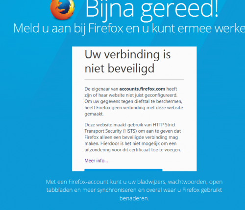 hallo ik heb het idee dat mij firefox helemaal de weg kwijt is ik kan me niet aanmelden bij sync firefox en ook zijn de beveiliging certificaten niet goed van heel wat websites wie kan mij helpen aub? dit is wat ik al heb geprobeerd en zie hier onder de meldingen 1 firefox opnieuw geinstaleerd 2 web browser vernieuwd 3 firefox opnieuw gestart in veilige modus 4 register opgeruimd. 5 geschiedenis gewist 6 windows systeemherstel terug geplaatst