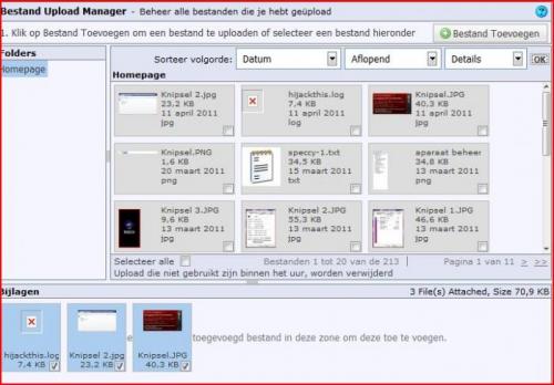 hallo ik wilde mij computer laten na kijken ik iets vreemds heb ondekt volgens mij op google.nl als ik namelijk een afbeelding of website opzoek dan blokeerd avast de website en dan word er weergeven dat de site niet bekenen kan worden dit zijn de meldingen hier onder en de hijacktislogje en ik had nog een vraagje als ik bestanden naar jullie site upload weet ik niet meer welke bestande dat zijn want er staan er zoveel kan ik dat zelf handmatig kunnen verwijderen of word het door de site zelf gedaan? hier onder zie je ook hoe dat er nu uit ziet [ATTACH]10171[/ATTACH] hijackthis.log