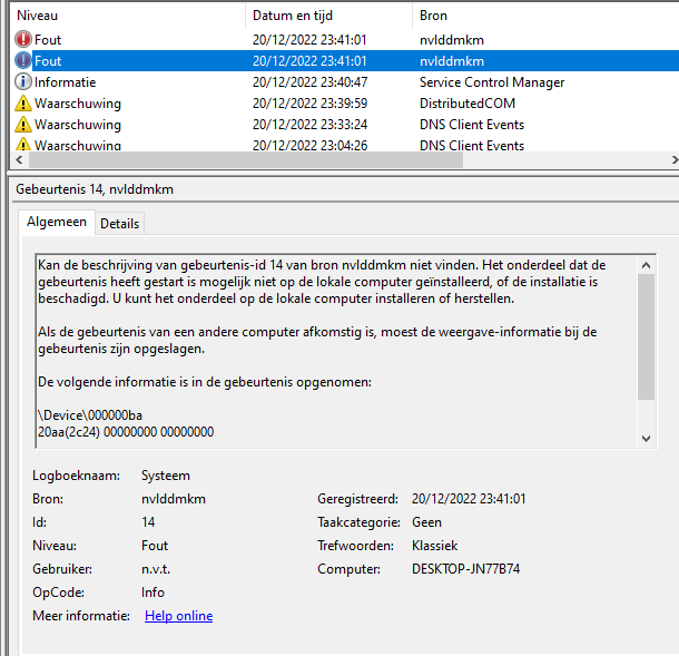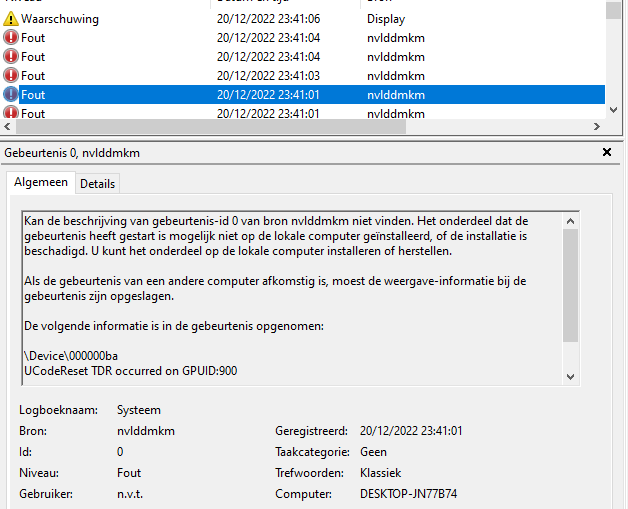 2. Bedankt voor je bericht! Het probleem is nog niet opgelost. DDU = Display Driver Uninstalled. Eigenlijk mijn volledige grafische kaart uninstalled & opnieuw geïnstalleerd. "Valkje" moest "vakje" zijn. De logboeken heb ik bekeken. Meestal komen er meerdere fouten op Daarstraks kreeg ik vooral foutmeldingen als: \Device\000000a3 Error occurred on GPUID: 900 In mijn logboek. Ik heb de screenshots genomen van de foutmeldingen die ik nu heb. Mijn computer is deze keer wel herstart. (uit zichzelf) Bijkomend heb ik twee foto's (door mijn gsm' genomen) van mijn scherm toegevoegd. Het zwarte scherm met de streepjes is hetgeen ik gisteren zag tijdens de crash. Nu kreeg ik "lijnen" op mijn scherm tijdens de crash. Deze lijnen kwamen ook terug bij de heropstart (dit is de eerste keer dat dat gebeurt) & alle tekentjes op mijn bureaublad waren heel groot. Als ik mijn pc herstart, is dit terug "normaal". Ik hoop echt dat er iemand weet wat er aan de hand is! Mijn grafische kaart valt net buiten garantie. Ik kan deze wel vervangen, maar dat zou geldverspilling zijn indien het probleem bv. aan het moederbord ligt. Mijn vermoeden is de grafische kaart, maar ik ben geen PC expert. Scherm crash gisteren Scherm heropstart nu