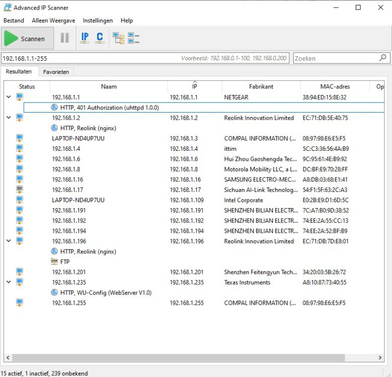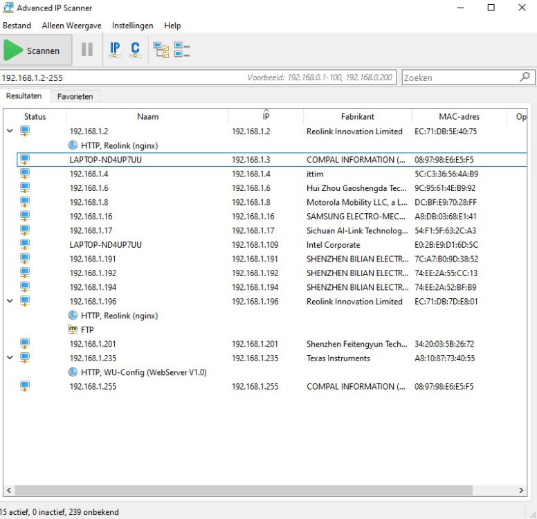 Oei, hopelijk moet de netwerkkabel niet ook op dezelfde poort van de router moet aangesloten zijn als bij de installatie, want ik kan me niet meer herinneren welke ik toen gebruikt heb. De IP scanner geeft volgende resultaten: en: Reolink en Shenzhen, dat zijn mijn camera's, maar daar word ik, eerlijk gezegd, niet veel wijzer van PS ik heb er zelfs al aan gedacht een tweede low budget routerke te kopen en die even aan te koppelen om die firmware update te kunnen doen van mijn drone, want daar is het allemaal mee begonnen. Maar wie weet welke problemen er dan weer opduiken...