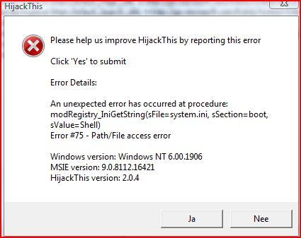 ok ik had problemen met het opstarten van hijackthis hij gaf 3 error reports ik heb toch een scan gemaakt maar eerst de drie error reports: Logfile of Trend Micro HijackThis v2.0.4 Scan saved at 18:30:08, on 18-8-2011 Platform: Windows Vista SP2 (WinNT 6.00.1906) MSIE: Internet Explorer v9.00 (9.00.8112.16421) Boot mode: Normal Running processes: C:\Windows\system32\Dwm.exe C:\Windows\system32\taskeng.exe C:\Program Files\TeamViewer\Version6\TeamViewer.exe C:\Windows\Explorer.EXE C:\Windows\WindowsMobile\wmdSync.exe C:\Program Files\Common Files\Java\Java Update\jusched.exe C:\Program Files\Common Files\Research In Motion\USB Drivers\RIMBBLaunchAgent.exe C:\Program Files\Synaptics\SynTP\SynTPEnh.exe C:\Program Files\Synaptics\SynTP\SynTPHelper.exe C:\Program Files\Mozilla Firefox\firefox.exe C:\Program Files\Windows Media Player\wmpnscfg.exe C:\Program Files\SpyShelter Personal Free\SpyShelter.exe C:\Program Files\Secunia\PSI\psi_tray.exe C:\Program Files\Trend Micro\HiJackThis\HiJackThis.exe C:\Windows\system32\SearchFilterHost.exe C:\Users\dave\Desktop\HijackThis.exe R0 - HKCU\Software\Microsoft\Internet Explorer\Main,Start Page = Orbit Downloader Start R1 - HKLM\Software\Microsoft\Internet Explorer\Main,Default_Page_URL = Hotmail, Messenger, nieuws en entertainment vind je op MSN.nl R1 - HKLM\Software\Microsoft\Internet Explorer\Main,Default_Search_URL = Bing R1 - HKLM\Software\Microsoft\Internet Explorer\Main,Search Page = Bing R0 - HKLM\Software\Microsoft\Internet Explorer\Main,Start Page = HP | MSN R0 - HKCU\Software\Microsoft\Internet Explorer\Main,Local Page = R0 - HKLM\Software\Microsoft\Internet Explorer\Main,Local Page = O2 - BHO: (no name) - AutorunsDisabled - (no file) O2 - BHO: Octh Class - {000123B4-9B42-4900-B3F7-F4B073EFC214} - C:\Program Files\Orbitdownloader\orbitcth.dll O2 - BHO: QFX Software KeyScrambler - {2B9F5787-88A5-4945-90E7-C4B18563BC5E} - C:\Program Files\KeyScrambler\KeyScramblerIE.dll O2 - BHO: avast! WebRep - {8E5E2654-AD2D-48bf-AC2D-D17F00898D06} - C:\Program Files\Alwil Software\Avast5\aswWebRepIE.dll O2 - BHO: Windows Live ID Sign-in Helper - {9030D464-4C02-4ABF-8ECC-5164760863C6} - C:\Program Files\Common Files\Microsoft Shared\Windows Live\WindowsLiveLogin.dll O3 - Toolbar: avast! WebRep - {8E5E2654-AD2D-48bf-AC2D-D17F00898D06} - C:\Program Files\Alwil Software\Avast5\aswWebRepIE.dll O3 - Toolbar: Grab Pro - {C55BBCD6-41AD-48AD-9953-3609C48EACC7} - C:\Program Files\Orbitdownloader\GrabPro.dll O4 - HKLM\..\Run: [Windows Mobile-based device management] %windir%\WindowsMobile\wmdSync.exe O4 - HKLM\..\Run: [sunJavaUpdateSched] "C:\Program Files\Common Files\Java\Java Update\jusched.exe" O4 - HKLM\..\Run: [RIMBBLaunchAgent.exe] C:\Program Files\Common Files\Research In Motion\USB Drivers\RIMBBLaunchAgent.exe O4 - HKCU\..\Run: [spyShelter] C:\Program Files\SpyShelter Personal Free\SpyShelter.exe O4 - Global Startup: Secunia PSI Tray.lnk O8 - Extra context menu item: &Download by Orbit - res://C:\Program Files\Orbitdownloader\orbitmxt.dll/201 O8 - Extra context menu item: &Grab video by Orbit - res://C:\Program Files\Orbitdownloader\orbitmxt.dll/204 O8 - Extra context menu item: Do&wnload selected by Orbit - res://C:\Program Files\Orbitdownloader\orbitmxt.dll/203 O8 - Extra context menu item: Down&load all by Orbit - res://C:\Program Files\Orbitdownloader\orbitmxt.dll/202 O9 - Extra button: (no name) - {5C106A59-CC3C-4caa-81A4-6D909B5ACE23} - C:\Program Files\KeyScrambler\KeyScramblerIE.dll O9 - Extra 'Tools' menuitem: &KeyScrambler Options - {5C106A59-CC3C-4caa-81A4-6D909B5ACE23} - C:\Program Files\KeyScrambler\KeyScramblerIE.dll O9 - Extra button: Toon of verberg HP Smart Web Printing - {DDE87865-83C5-48c4-8357-2F5B1AA84522} - C:\Program Files\HP\Digital Imaging\Smart Web Printing\hpswp_BHO.dll O11 - Options group: [ACCELERATED_GRAPHICS] Accelerated graphics O18 - Protocol: AutorunsDisabled - (no CLSID) - (no file) O22 - SharedTaskScheduler: Component Categories cache daemon - {8C7461EF-2B13-11d2-BE35-3078302C2030} - C:\Windows\system32\browseui.dll O23 - Service: Andrea ST Filters Service (AESTFilters) - Andrea Electronics Corporation - C:\Windows\System32\DriverStore\FileRepository\stwrt.inf_827e372d\aestsrv.exe O23 - Service: Ati External Event Utility - ATI Technologies Inc. - C:\Windows\system32\Ati2evxx.exe O23 - Service: avast! Antivirus - AVAST Software - C:\Program Files\Alwil Software\Avast5\AvastSvc.exe O23 - Service: Com4QLBEx - Hewlett-Packard Development Company, L.P. - C:\Program Files\Hewlett-Packard\HP Quick Launch Buttons\Com4QLBEx.exe O23 - Service: hpqwmiex - Hewlett-Packard Development Company, L.P. - C:\Program Files\Hewlett-Packard\Shared\hpqwmiex.exe O23 - Service: HP Service (hpsrv) - Hewlett-Packard Company - C:\Windows\system32\Hpservice.exe O23 - Service: HQKWI - Hewlett-Packard Company - (no file) O23 - Service: JEBDCL - Integrated Technology Express, Inc. - (no file) O23 - Service: Recovery Service for Windows - Unknown owner - C:\Program Files\SMINST\BLService.exe O23 - Service: Cyberlink RichVideo Service(CRVS) (RichVideo) - Unknown owner - C:\Program Files\CyberLink\Shared files\RichVideo.exe O23 - Service: Secunia PSI Agent - Secunia - C:\Program Files\Secunia\PSI\PSIA.exe O23 - Service: Secunia Update Agent - Secunia - C:\Program Files\Secunia\PSI\sua.exe O23 - Service: Audio Service (STacSV) - IDT, Inc. - C:\Windows\System32\DriverStore\FileRepository\stwrt.inf_827e372d\STacSV.exe O23 - Service: TeamViewer 6 (TeamViewer6) - TeamViewer GmbH - C:\Program Files\TeamViewer\Version6\TeamViewer_Service.exe O23 - Service: TV Background Capture Service (TVBCS) (TVCapSvc) - Unknown owner - C:\Program Files\Hewlett-Packard\Media\TV\Kernel\TV\TVCapSvc.exe O23 - Service: TV Task Scheduler (TVTS) (TVSched) - Unknown owner - C:\Program Files\Hewlett-Packard\Media\TV\Kernel\TV\TVSched.exe -- End of file - 5969 bytes en hier is de speccy link: http://speccy.piriform.com/results/mxHc8uAi6qn1cIkLcTZRkwk mvg dave