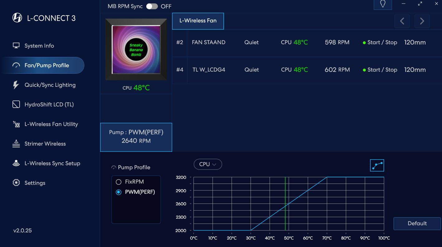 Aantal fans (en posities): 2 sets Lian Li UNI FAN TL120 LCD Reverse Blade Wireless Triple Pack case fan (op de bodem en aan de achterkant/zijkant) Aangesloten op GHA_FAN2 en daarna beide op de L Connect wireless