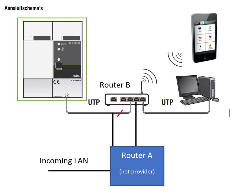 2. Ik heb een domotica systeem van Niko geïnstalleerd. De IP-interface van het domotica systeem staat in de kelder (in mijn elektrische kast) en is via LAN verbonden met de router (router A) van mijn net provider die ook in mijn kelder staat. Achter de router van de net provider heb ik een tweede router geïnstalleerd (router B ) op het gelijkvloers. Via deze tweede router heb ik een WIFI netwerk opgezet. Op mijn smartphone heb ik een app van Niko geïnstalleerd om de lichten etc. te bedienen via mijn smartphone. Echter, omdat de IP-interface van Niko niet rechtstreeks verbonden is met router B, maar met router A, kan mijn Smartphone app niet verbinden met de Niko IP-interface. In bijlage een situatieschema van mijn netwerk. Kan ik de instellingen van router B (of A) wijzigen zodat ik via mijn wifi netwerk van router B toch verbinding kan maken met de IP-interface van Niko die verbonden is met router A? Router B is een TP-link Archer C2300.
