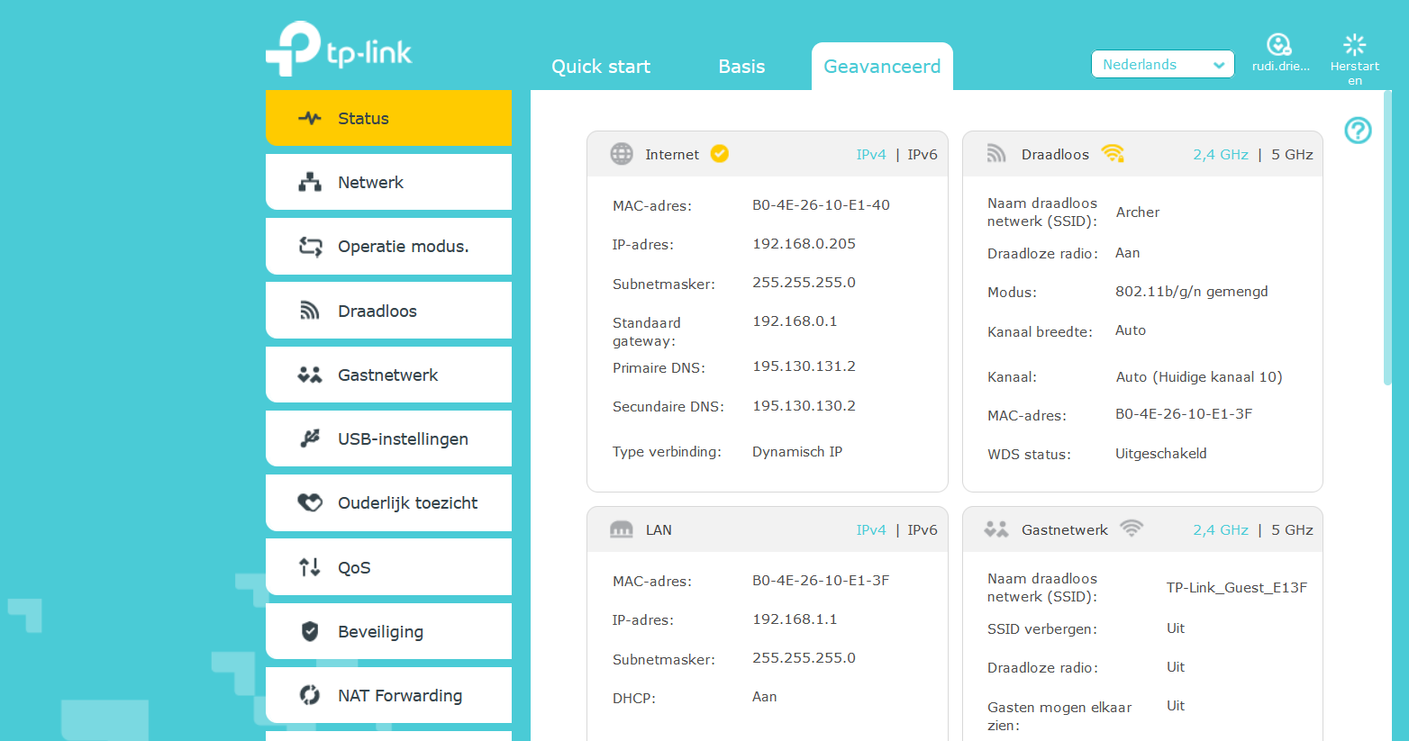 Sinds gisteren is de geavanceerde instellingpagina terug zichtbaar en bewerkbaar. Eerste vaststelling, daar staat min lan ip op 192.168.0.1, nochtans is dit via diverse scans en apparaten 192.168.1.1 geworden. 2de vaststelling, bij het invullen van de externe poort die vroeger idem was aan de interne staat nu verplicht een scheidingsteken, zonder dit kan je geen geldig nummer invoeren. Dus nog niet direct verder geraakt. -