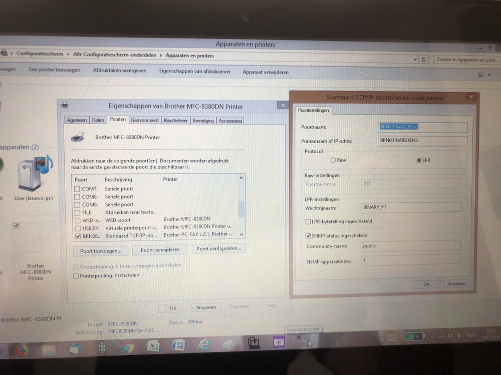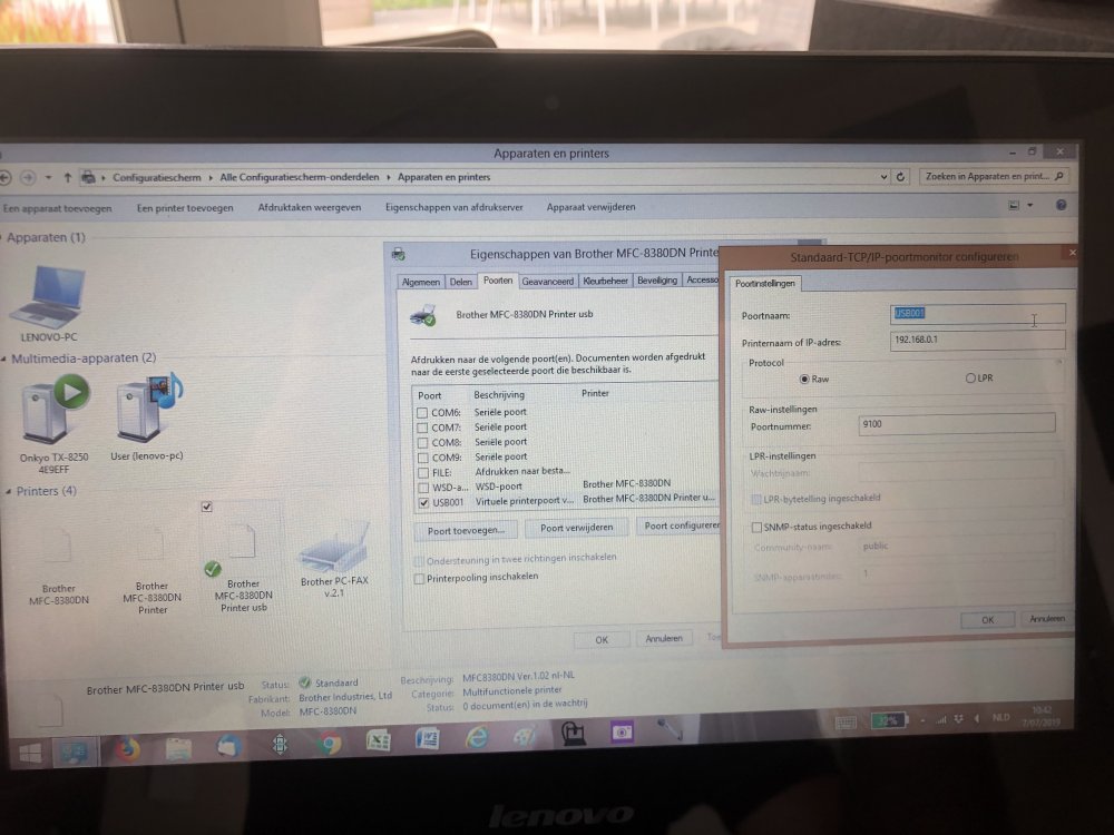 Ik heb alle stappen via de brother handleiding uitgevoerd, installatie uitgevoerd met uischakelen van antivirus en windows firewall. Resultaat is dat als de laptop met netwerkkabel verbonden is met de printer het afdrukken lukt. Poort die gebruikt wordt is, is een standaard TCP/IP poort. Indien ik dit zo wil blijven doen moet ik een langere netwerkkabel gebruiken want printer en laptop staan niet dicht bij elkaar. Tegelijkertijd is er bij "apparaten en printers" een printer geรฏnstalleerd die gebruik maakt van een WSD-poort en nog een Pc-fax toestel, onze printer kan ook faxen. Voorlopig laat ik die nog staan. Plug ik de netwerkkabel van de printer in de router of rechtstreeks in de modem van telenet lukt het printen niet meer, ik ben niet op de hoogte of het op die manier zowiezo wel lukt. Was maar een idee om via het netwerk toch (draadloos) te kunnen printen. Unplug ik de netwerkkabel van printer naar de laptop en maak ik een verbinding via usb van printer naar laptop installeert hij de printer opnieuw, printernaam idem met"kopie1" erna, heb dit vernader naar usb om wat overzicht te houden, en maakt gebruik van de "USB001 virtuele printerpoort". De andere USB001 poort als standaard TCP/IP poort staat er nog steeds tussen. Ik stuur wat foto's mee om ea te verduidelijken. Conclusie, al een stapje verder, maar nog niet draadloos ๐