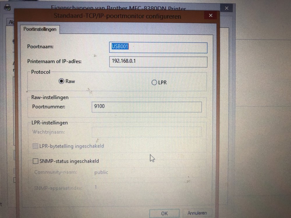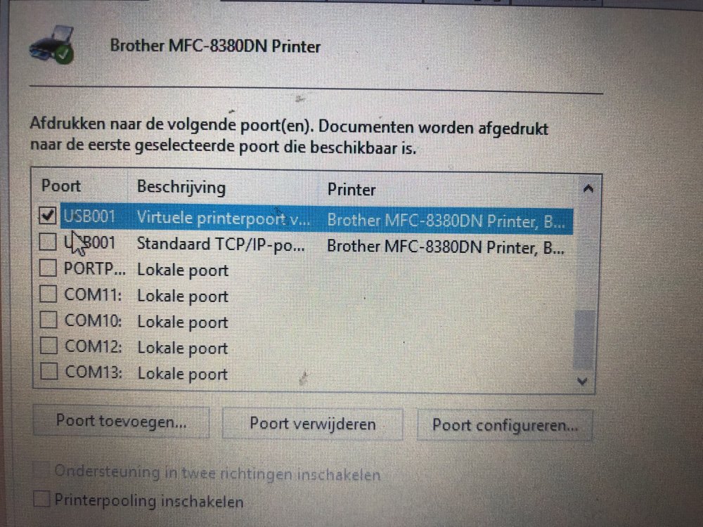 9. Die 2 poorten hebben ook dezelfde instellingen, en zijn niet te verwijderen. Op de laptop waar de printer wel op werkt kan ik de poortconfiguratie dan weer niet openen hoe daar de instellingen zijn.