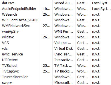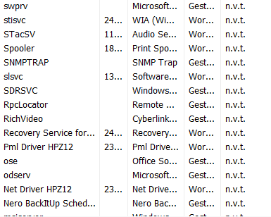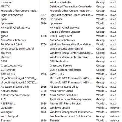 hallo, ik heb spyware op mijn laptop? krijg altijd pop-ups. heb een virus verwijderd met avira (in system32) maar nu krijg ik bij het opstarten een foutmelding dat hij die file niet vind... ik heb dat venstertje nog niet kunnen screenshotten maar zal het zeker doen... PS pop-ups in internet explorer terwijl firefox standaard is??? in de bijlage een hele hoop processen en vooral services . -