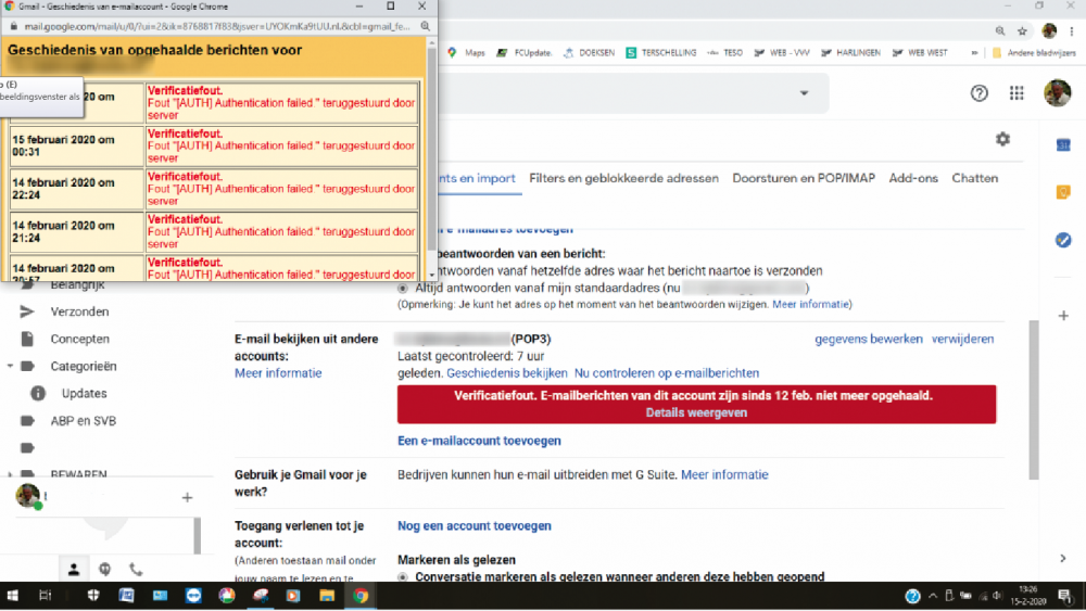 9. Wat ik gedaan heb : Ik kreeg een helder momentje , en heb de laptop van mijn vrouw naast de mijne geplaatst . En toen kon ik alles vergelijken , want die van mijn vrouw werkt wel goed . Het gaat nu om : Accounts en import En daar viel mij het volgende op: Art. Mail verzenden als : naam < naam@gmail.com standaard ..... gegevens bewerken naam < naam@home.nl als standaard instellen gegevens bewerken verwijderen Mail is verzonden via : smtp.home.nl Beveiligde verbinding op poort 587 via TLS Dit heb ik er niet staan . Dan bij :E-mail bekijken uit andere accounts : Laatst gecontroleerd In dit geval 1 uur geleden . Geschiedenis bekijken . Nu controleren op e-mail berichten ( Dit staat er bij mij niet , alleen geschiedenis bekijken ) Ik dacht dat dit wel handig was , en ik hoop dat je er wat mee kunt