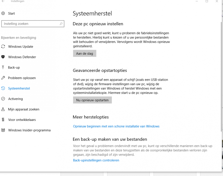 Het makkelijkste is voor mij een ,, herstel ,, doen , naar een eerdere datum . Maar ik heb nu met m,n nieuwe laptop een ander beeld als op de oude . Zo ook met Herstel , op de oude stond het daar gewoon als ,, herstel ,, Ik doe het plaatje er wel bij , dan kun je misschien vertellen welke ik moet doen . In ieder geval niet naar fabrieksinstellingen