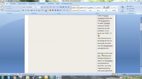 Ik wil een artikel afdrukken van het forum van campersite.nl. Dit doe ik als volgt ; Ik ga het bewuste art. selecteren Dan rechts klikken , en kopieeren Dan naar word > ctrl - v Dan het artikel weer selecteren , en de lettergrootte kieze , en afdrukken . Maar het gaat fout als ik naar word ga , want daar staat de tekst onder elkaar Aan de rechterzijde ( Bijlage ) Hoe krijg ik dit pagina breed ?