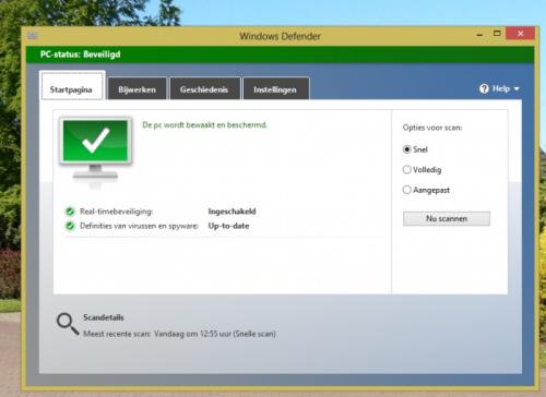 Ik ben hier al eerder mee geweest , maar misschien was mijn uitleg niet erg duidelijk , dus probeer ik het nog een keer . Ik heb zelf een laptop met windows 7 , en daar heb ik rechtsonder in de taakbalk een groen mapje staan van microsoft security Essentials . Als ik hier op klik , krijg ik een scherm met een overzicht van de beveiliging . En dat is prettig , want als er iets niet goed gaat wordt groen geel/oranje , en dan moet ik even scannen . Nu het probleem : De laptop van mijn vrouw , met window 8 heeft dat groene mapje rechtsonder in de taakbalk NIET. In plaats daarvan heeft zij : windows defender , een soort stenen muurtje , en die staat links in de taakbalk Als ik hier op klik krijg ik wel het scherm met overzicht van de beveiliging . Het vervelende is , dat deze niet aangeeft (andere kleur ) dat er gescand moet worden . Ik heb het zojuist even gecontroleerd , en er werd aangegeven dat de laptop niet beveiligd was , dus scannen Dit is al een hele tijd zo , en toch heb ik in het begin toen ze de laptop in gebruik nam , wel altijd dat groene mapje gehad . Ik doe er een afdruk bij van het mapje op MIJN laptop, om te laten zien welke ik mis op de andere laptop.