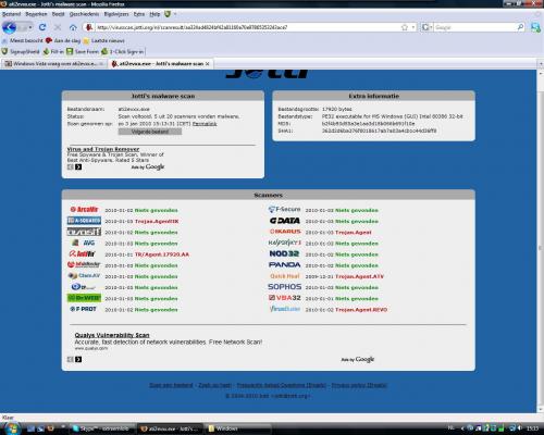 Het staat in c\windows, en ik zie dat er meerdere .exe bestanden zijn met hetzelfde icoontje en de zelfde willekeurige namen die ook in c\windows staat. hier nog een logje. Logfile of Trend Micro HijackThis v2.0.3 (BETA) Scan saved at 21:34:50, on 2/01/2010 Platform: Windows Vista SP2 (WinNT 6.00.1906) MSIE: Internet Explorer v8.00 (8.00.6001.18865) Boot mode: Normal Running processes: C:\Windows\system32\Dwm.exe C:\Windows\Explorer.EXE C:\Windows\system32\taskeng.exe C:\Program Files\Windows Defender\MSASCui.exe C:\Program Files\Dell\DellDock\DellDock.exe C:\Program Files\Dell Support Center\bin\sprtcmd.exe C:\Program Files\Intel\Intel Matrix Storage Manager\IAAnotif.exe C:\Program Files\Microsoft IntelliType Pro\itype.exe C:\Program Files\Microsoft LifeChat\LifeChat.exe C:\Program Files\Telemeter 3.0\Telemeter3.exe C:\Program Files\Creative\Sound Blaster X-Fi\Volume Panel\VolPanlu.exe C:\Program Files\Windows Live\Device Manager\msgrdvmn.exe C:\Program Files\Alwil Software\Avast4\ashDisp.exe C:\Windows\System32\Ctxfihlp.exe C:\Program Files\ATI Technologies\ATI.ACE\Core-Static\MOM.exe C:\Windows\ati2evxx.exe C:\Program Files\COMODO\COMODO Internet Security\cfp.exe C:\Program Files\Windows Sidebar\sidebar.exe C:\Program Files\Creative\Sync Manager Unicode\CTSyncU.exe C:\Program Files\Common Files\Dell\apache\bin\httpd.exe C:\Program Files\Windows Live\Messenger\msnmsgr.exe C:\Program Files\Spybot - Search & Destroy\TeaTimer.exe C:\Program Files\Microsoft Office\Office12\ONENOTEM.EXE C:\Program Files\Windows Media Player\wmpnscfg.exe C:\Windows\SYSTEM32\CTXFISPI.EXE C:\Windows\system32\conime.exe C:\Program Files\ATI Technologies\ATI.ACE\Core-Static\CCC.exe C:\Windows\system32\wuauclt.exe C:\Windows\system32\wbem\unsecapp.exe C:\Program Files\Steam\Steam.exe C:\Program Files\Mozilla Firefox\firefox.exe C:\Program Files\TrendMicro\HiJackThis\HiJackThis.exe C:\Windows\System32\wscript.exe R1 - HKCU\Software\Microsoft\Internet Explorer\Main,Search Page = Bing R0 - HKCU\Software\Microsoft\Internet Explorer\Main,Start Page = MSN.com R1 - HKLM\Software\Microsoft\Internet Explorer\Main,Default_Page_URL = MSN.com R1 - HKLM\Software\Microsoft\Internet Explorer\Main,Default_Search_URL = Bing R1 - HKLM\Software\Microsoft\Internet Explorer\Main,Search Page = Bing R0 - HKLM\Software\Microsoft\Internet Explorer\Main,Start Page = MSN.com R0 - HKLM\Software\Microsoft\Internet Explorer\Search,SearchAssistant = R0 - HKLM\Software\Microsoft\Internet Explorer\Search,CustomizeSearch = O1 - Hosts: ::1 localhost O2 - BHO: Adobe PDF Reader Help bij koppelingen - {06849E9F-C8D7-4D59-B87D-784B7D6BE0B3} - C:\Program Files\Common Files\Adobe\Acrobat\ActiveX\AcroIEHelper.dll O2 - BHO: AcroIEHelperStub - {18DF081C-E8AD-4283-A596-FA578C2EBDC3} - C:\Program Files\Common Files\Adobe\Acrobat\ActiveX\AcroIEHelperShim.dll O2 - BHO: Spybot-S&D IE Protection - {53707962-6F74-2D53-2644-206D7942484F} - C:\PROGRA~1\Spybot - Search & Destroy\SDHelper.dll O2 - BHO: Groove GFS Browser Helper - {72853161-30C5-4D22-B7F9-0BBC1D38A37E} - C:\Program Files\Microsoft Office\Office12\GrooveShellExtensions.dll O2 - BHO: Aanmeldhulp voor Windows Live ID - {9030D464-4C02-4ABF-8ECC-5164760863C6} - C:\Program Files\Common Files\Microsoft Shared\Windows Live\WindowsLiveLogin.dll O2 - BHO: Google Toolbar Notifier BHO - {AF69DE43-7D58-4638-B6FA-CE66B5AD205D} - C:\Program Files\Google\GoogleToolbarNotifier\5.1.1309.3572\swg.dll O2 - BHO: Java Plug-In 2 SSV Helper - {DBC80044-A445-435b-BC74-9C25C1C588A9} - C:\Program Files\Java\jre6\bin\jp2ssv.dll O4 - HKLM\..\Run: [Windows Defender] %ProgramFiles%\Windows Defender\MSASCui.exe -hide O4 - HKLM\..\Run: [dellsupportcenter] "C:\Program Files\Dell Support Center\bin\sprtcmd.exe" /P dellsupportcenter O4 - HKLM\..\Run: [iAAnotif] "C:\Program Files\Intel\Intel Matrix Storage Manager\Iaanotif.exe" O4 - HKLM\..\Run: [itype] "C:\Program Files\Microsoft IntelliType Pro\itype.exe" O4 - HKLM\..\Run: [LifeChat] "C:\Program Files\Microsoft LifeChat\LifeChat.exe" O4 - HKLM\..\Run: [Telemeter 3.0] "C:\Program Files\Telemeter 3.0\telemeter3.exe" O4 - HKLM\..\Run: [updReg] C:\Windows\UpdReg.EXE O4 - HKLM\..\Run: [VolPanel] "C:\Program Files\Creative\Sound Blaster X-Fi\Volume Panel\VolPanlu.exe" /r O4 - HKLM\..\Run: [WindowsLivePhone] C:\Program Files\Windows Live\Device Manager\msgrdvmn.exe /AutoRun O4 - HKLM\..\Run: [avast!] C:\PROGRA~1\ALWILS~1\Avast4\ashDisp.exe O4 - HKLM\..\Run: [bluetooth HCI Monitor] RunDll32 HCIMNTR.DLL,RunCheckHCIMode O4 - HKLM\..\Run: [startCCC] "C:\Program Files\ATI Technologies\ATI.ACE\Core-Static\CLIStart.exe" MSRun O4 - HKLM\..\Run: [CTxfiHlp] CTXFIHLP.EXE O4 - HKLM\..\Run: [Windows Plug-n-Play Device Manager] C:\windows\ati2evxx.exe O4 - HKLM\..\Run: [Windows Runtime Manager] C:\windows\system32\drivers\rundll32.exe O4 - HKLM\..\Run: [COMODO Internet Security] "C:\Program Files\COMODO\COMODO Internet Security\cfp.exe" -h O4 - HKCU\..\Run: [sidebar] C:\Program Files\Windows Sidebar\sidebar.exe /autoRun O4 - HKCU\..\Run: [CTSyncU.exe] "C:\Program Files\Creative\Sync Manager Unicode\CTSyncU.exe" O4 - HKCU\..\Run: [DellSupportCenter] "C:\Program Files\Dell Support Center\bin\sprtcmd.exe" /P DellSupportCenter O4 - HKCU\..\Run: [WindowsLivePhone] "C:\Program Files\Windows Live\Device Manager\msgrdvmn.exe" /AutoRun O4 - HKCU\..\Run: [msnmsgr] "C:\Program Files\Windows Live\Messenger\msnmsgr.exe" /background O4 - HKCU\..\Run: [WMPNSCFG] C:\Program Files\Windows Media Player\WMPNSCFG.exe O4 - HKCU\..\Run: [spybotSD TeaTimer] C:\Program Files\Spybot - Search & Destroy\TeaTimer.exe O4 - HKUS\S-1-5-19\..\Run: [sidebar] %ProgramFiles%\Windows Sidebar\Sidebar.exe /detectMem (User 'LOCAL SERVICE') O4 - HKUS\S-1-5-19\..\Run: [WindowsWelcomeCenter] rundll32.exe oobefldr.dll,ShowWelcomeCenter (User 'LOCAL SERVICE') O4 - HKUS\S-1-5-20\..\Run: [sidebar] %ProgramFiles%\Windows Sidebar\Sidebar.exe /detectMem (User 'NETWORK SERVICE') O4 - HKUS\S-1-5-21-3886827495-4185191458-4067385298-1004\..\Run: [sidebar] %P