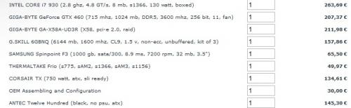 hallo, ik ben geïntresseerd in het kopen van een nieuwe pc... mijn budget is 1100-1400 EUR ik kwam uit bij dit systeem : zie bijlage ik heb mijn vorige gekocht bij power4pc , deze is daar ook geconfigureerd als iemand een goedkopere site weet.. laat iets weten wat het zeker moet zijn: i7 (op X58 chipset) overclockt goed en geeft een treffelijk resultaat met SLI ( op de p55 is de PCI controller in de processor gebouwd en worden de slots van x16 naar x8 gedegradeerd) ik wil namalijk later nog een GTX460 bijsteken , en ik ga maar voor een dual SLI , de 460 geeft geen verder support .. mvg xioros ps: besturing systeem hoeft niet , heb zelf nog een (legale) windows 7 liggen ...
