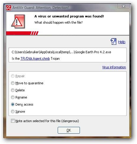 Omdat MBAM blokkeerde bij de bewuste file moest ik taakbeheer inschakelen. AVIRA gaf mij dadelijk een melding (zie screen hierboven). Nu koos ik voor de optie 'delete'. MBAM ging hierop verder met de scan en gaf geen detectie op als resultaat. Ik liet MBAM nog eens draaien met telkens een negatief resultaat en nu zonder onderbreking of 'freeze'. Volgens mij is het probleem opgelost. Nu ja, als Kape dan toch even HJT nakijkt en mij verder wil adviseren. -