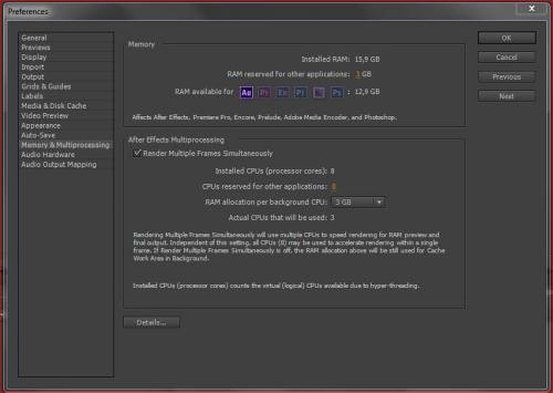 Voor After Effects kan je het toegewezen ramgeheugen wijzigen in 'edit' --> 'preferences --> 'general'--> 'memory and multiprocessing' Ook het aantal 'cores' kan je toewijzen. Zoals bij mij heb ik van de 16 GB ram 13 Gb toegewezen aan After Effects en alle acht cores. Ik mag zeker niet klagen over de rendertijd maar geduld is soms een mooie deugd. Mijn PC specs zijn te zien in mijn profiel. -
