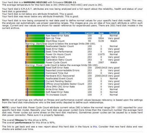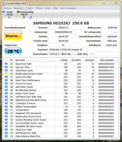 Ik installeerde het programma CrystalDiskInfo om de toestand van mijn harde schijven te kontroleren. Mijn D schijf gaf een waarschuwing: reallocated sector count. Ik gebruik deze schijf als systeem-backupschijf. Ik had gedacht nog even te wachten gezien de prijzen van de HDD's na de overstromingen in Thailand zeer sterk stegen en nu pas beginnen te dalen. Ik voeg een knipsel bij van CrystalDiskInfo. Houdt mijn harde schijf het nog even vol of moet ik hem al vervangen. (Schijf is 5 jaar oud)