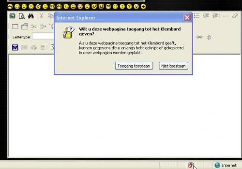 Hallo nadat ik gisteren mijn IE8 terug naar standaard had gezet, krijg ik telkens een vraag "Toegang toestaan" en dit als ik op een forum een afbeelding wil plakken, wil graag dat dit niet meer terug komt, mijn tweede vraagje is moet telkens al de gegevens intypen,terwijl er geen vinkje staat bij de opgeslagen formuliergegevens hartelijke dank op voorhand Reintje