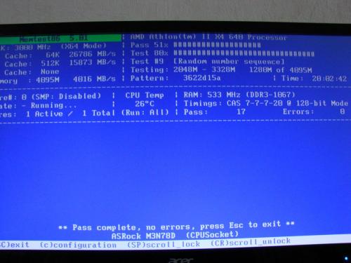 Het was me gelukt om memtest op een cd te branden en deze draaid nu 1:45:00, heeft nu gedaan Cores: 1active/ 1total (run:All); Pass 2 Errors 0 onderaan staat **pass complete, no errors, pres Esc toe exit** ASRock M3N78D (CPUSocket) Hoe lang moet dit door draaien PS heb even via laptop gereageerd zodat pc door kan draaien.