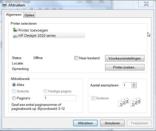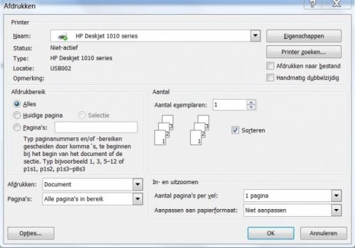 Hallo beste mensen, Ik heb een probleem mijn nieuwe Hp Deskjet 1010 print wel plaatjes of via kladblok maar geen word bestanden of ecel. Me pc is een windows 7 en in heb een office 2007. voor dat ik een nieuwe printer kocht werkte de oude printer deskjet 5900 gewoon via office 2007, deze heb ik verwijderd en de nieuwe geinstalleerd. Als in via apparaten en printers kijk staat daar als ik printer aan heb staan licht het plaatje op maar staat er een groeneV voor en hij is in gesteld als standaard printer. zo staat toestel aan en zo is toestel uit. Als ik nu een test afdruk maak doet de printer dat ook goed. Als ik nu naar ecel of word ga en ik wil tekst uit printen dan komt er een nieuwe venster met daar in dat deskjet 1010 met een groeneV in staat. Maar deze staat als niet aktief Dit veranderd ook niet als ik printer eerst aan zet. Ook nu wil hij niet printen. Ga ik nu naar de helpsite van bv ecel of word dan krijg ik een venster met daar boven in een afdrukken aan klik krijg ik een heel andere afdruk venster weer. En als ik nu op afdrukken klik dan drukt hij netjes af Ook als ik het office picture maneger gebruik dak drukt hij dat netjes af ook tekst wat getypt word in kladblok drukt hij af. Was ook al in kontact geweest met HP deze hebben online bij mij in de pc wezen kijken en gekeken als er dingen goed of fout waren ik moest toen na op starten pc een toepassing bestand DJ1010_188(2) installeren en als dat gedaan was deed hij het wel weer zo niet moest ik in contact gaan met microsoft. Ook zijn alle windows/office updates up todate. Wat kan hier nu aan de hand zijn hopelijk kan iemand me helpen. Mvg Henk