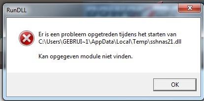 LS. Bij het opstarten van W7 (hp) krijg ik de melding : Er is een probleem opgetreden tijdens het starten van C:\Users\GEBRUI~1\AppData\Temp\sshnas21.dll. Kan de opgegeven module niet vinden. Kan iemand mij helpen om dit probleem te verhelpen? En zou het er mee te maken kunnen hebben dat ik Office 11 en 12 (2003 en 2007) op het systeem heb staan? want als ik een XLS file wil openen, wordt Excel 2007 opgestart en niet Excel 2003.