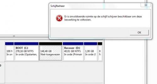 Hallo, Mijn laptop heeft een grote C-schijf waarop alle programma's staan, nu wilde ik een nieuwe partitie aanmaken om aan aparte dataschijf te maken. Volgens de help van windows moest ik eerst de bestaande c-schijf verkleinen en dan het nieuwe deel toewijzen als bijv F-schijf. Het verkleinen lukt, maar het toewijzen van het nieuwe deel niet! Ik kan het niet-toegewezen deel niet geactiveerd (wegens onvoldoende schijfruimte, zie bijlage). Hoe los ik dit op? Alvast bedankt. Chris