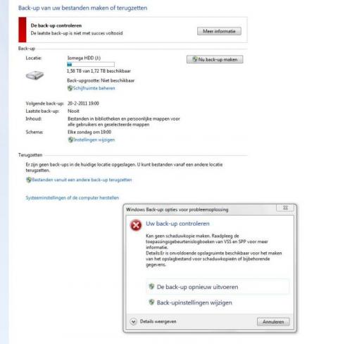 Norton doet het nu. Dank hiervoor. De backup functie van windows 7 blijft echter hardnekkig weigeren (al in een eerdere discussie aan bod geweest). Ik krijg de volgende meldingen (of ik nu op DVD, Externe HD of interne partitie probeer weg te schrijven) zie bijlage.