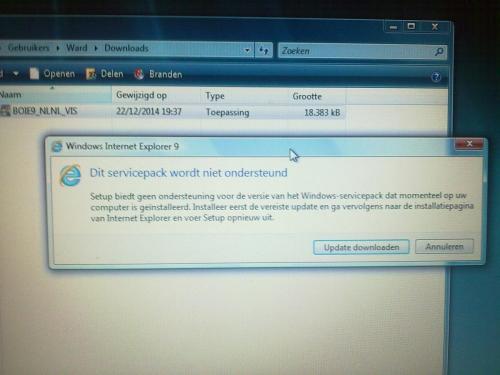 16. Windows Updates zijn geïnstalleerd. Daarna probeer ik IE 9 te installeren (want ik had standaard nog 7). Ik weet dat er nog recentere zijn, maar ik heb 9 nodig voor Vista. Maar als ik die probeer te installeren krijg ik volgende melding op de foto. Dus die servicepacks, waar kan ik die installeren? Blijkbaar niet bij de gewone Windows Update? Want die is uitgevoerd. Als ik op 'update downloaden' klik leidt ie mij naar een link die niet meer bestaat (wss iets uit 2008?)