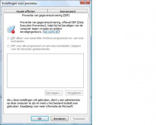 9. Heb ik gedaan. Skype sluit zich weer af en als ik die procedure volg om DEP voor bepaalde programma's en services in te schakelen, behalve voor, dan kan ik daar niet meer op klikken, op geen van de twee mogelijkheden. Geen verwijderen of toevoegen mogelijk.