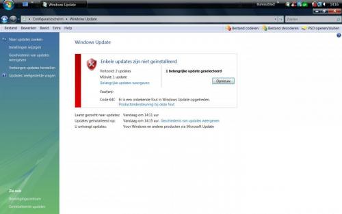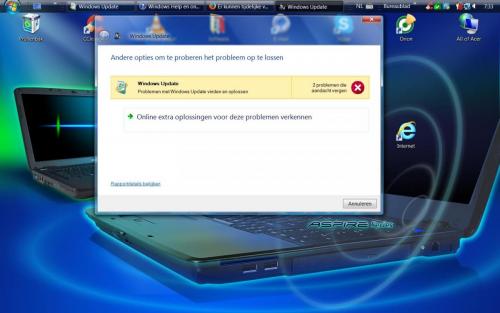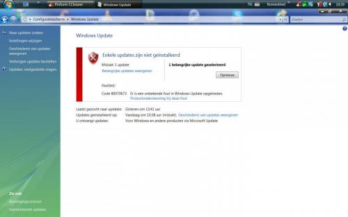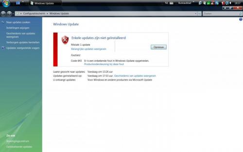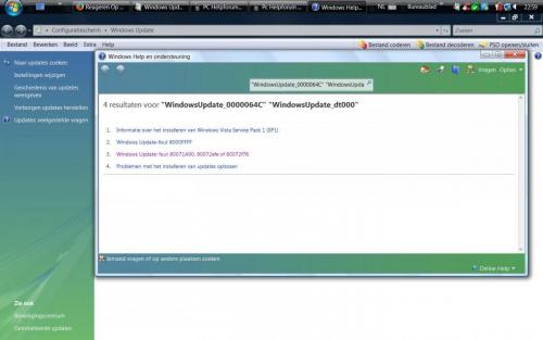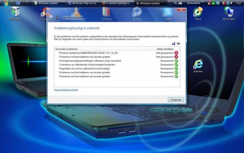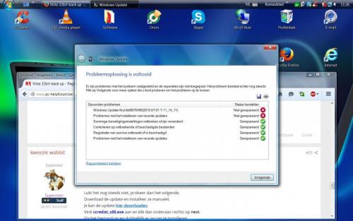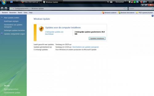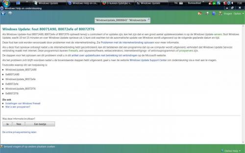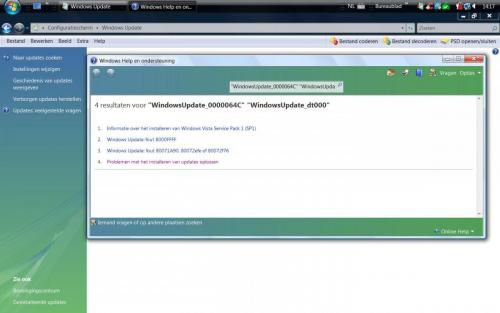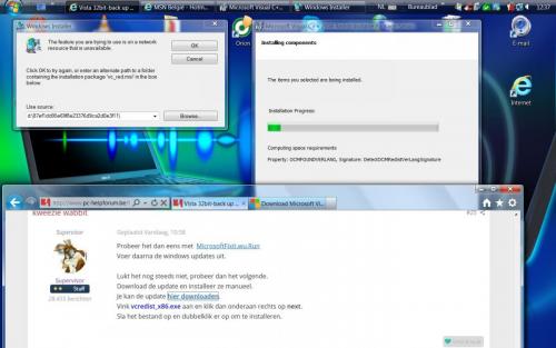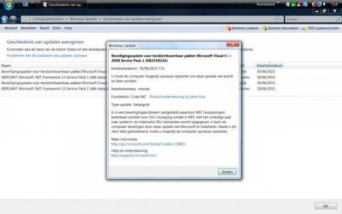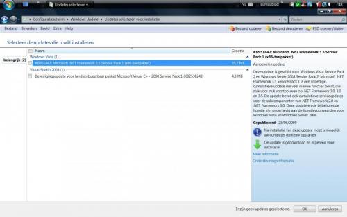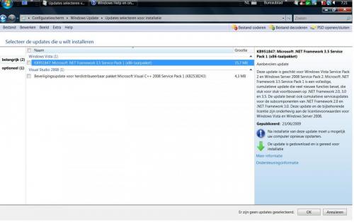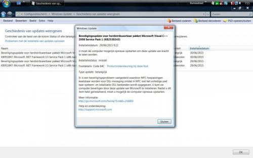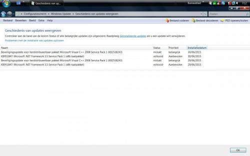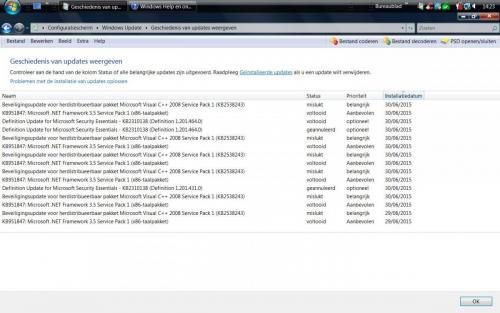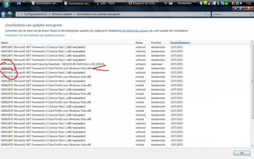 -Windows update : Lijkt erop dat alles zou zijn geherinstalleerd. Maar toch is er in de taakbalk het icoontje 'windows update' ?! -Er zou dus nog 1 update zijn nl KB982670: Microsoft .NET Framework 4 Client Profile voor Windows Vista x86 Installatiedatum: 5/07/2015 9:44 Installatiestatus: mislukt Foutdetails: Code 643 Type update: Aanbevolen Microsoft .NET Framework 4 Client Profile biedt een deelverzameling van functies van .NET Framework 4. Client Profile is ontworpen om clienttoepassingen uit te voeren en de installatie voor Windows Presentation Foundation (WPF) en Windows Forms-technologie zo snel mogelijk te maken. Meer informatie: http://go.microsoft.com/fwlink/?LinkId=191022 Help en ondersteuning: http://support.microsoft.com zie bijlage. -Wat de 'back-up' betreft : ''Systeemvak NTI Backup Now 5'' is thans aanwezig in de taakbalk. zie bijlage