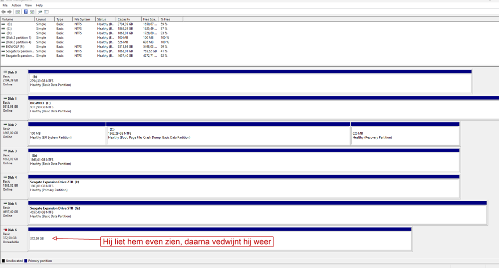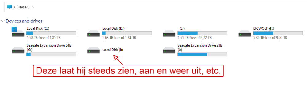 Geacht forum, ik heb een oude Toshiba externe USB-2 HD uit 2006 met voor mij belangrijke videobeelden, de elektrische voeding van de HD gaat nog via een rond stekkertje met pennetjes. het probleem is dat hij zich niet vertoont in mijn nieuwe computer, als ik op Deze PC klik komt er soms een USB Label Local Disk (I:) tevoorschijn, maar zonder inhoud. Ook in Disk Management komt hij niet tevoorschijn, ik hoopte dat ik hem daar een nieuwe Drive letter kon geven... Gegevens HD schijf: Toshiba Hi-Speed USB 2.0 Externe Hard Drive, Type: PX1268E-1G40 opslag-400 GB Een kennis van mij heeft een oude computer van 2014 met Windows 7 of 8 en daar komt hij wel tevoorschijn, dus moet ook de voedingskabel in orde zijn, het overzenden van een gedeelte van mijn videobeelden naar een andere Expansion Drive duurde ruim 3 dagen, het overzetten van deze gegevens naar mijn nieuwe PC duurde 54 minuten. Is er misschien toch nog een mogelijkheid om hem toch nog aan de praat te krijgen svp?