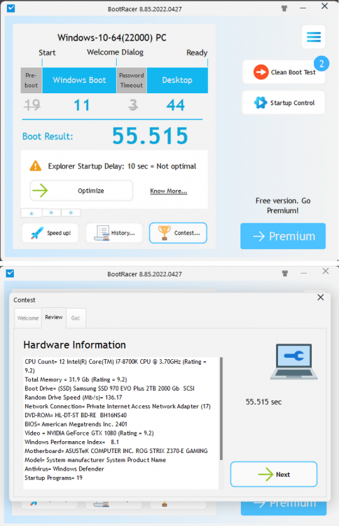 Heren, via Bootracer, waar ik nu de Premium versie van gekocht heb, en het verminderen van opstart files is de opstartsnelheid nu 1'17" (77 sec). Passer merkte op dat mijn Capacity in de BIOS slechts 16384 MB was. Ik heb nu gevonden dat de 2 RAM kaarten in het 2e en 4e slot gestoken moeten worden. Ze zaten gisteren in het 1e en 3e slot. Na het verwisselen (met rubber handschoenen) ben ik weer in de BIOS gaan kijken en nu zie ik Capacity 32768 MB staan. Hopelijk ga ik deze verbetering merken in mijn PC. Ook de temperatuur van mijn C drive is nu beter gekoeld. Langs deze weg wil ik PC Helpforum en met name Passer hartelijk bedanken voor het zorgvuldig nakijken van mijn PC gegevens, ik vind zoiets erg knap. Passer: Maar (en nu kom ik op mijn quote terug): de oorzaak kan ook zijn dat je systeem mal- of spyware opgedaan heeft zodat je systeem 'achter je rug om' met van alles bezig is. Daarom zou het niet slecht zijn daarop eens een controle te doen. Je verliest er tenslotte niets mee... (en je weet maar nooit dat zo iets al direct actief wordt bij het opstarten en op die manier ook je opstarten gaat vertragen) Morgen wil ik op ook mijn computer op virussen, mal en spyware scannen.