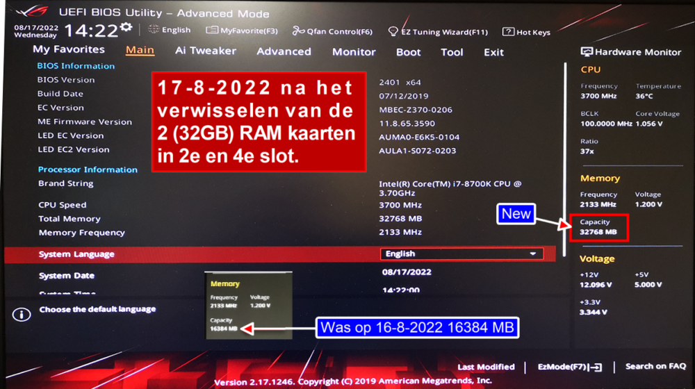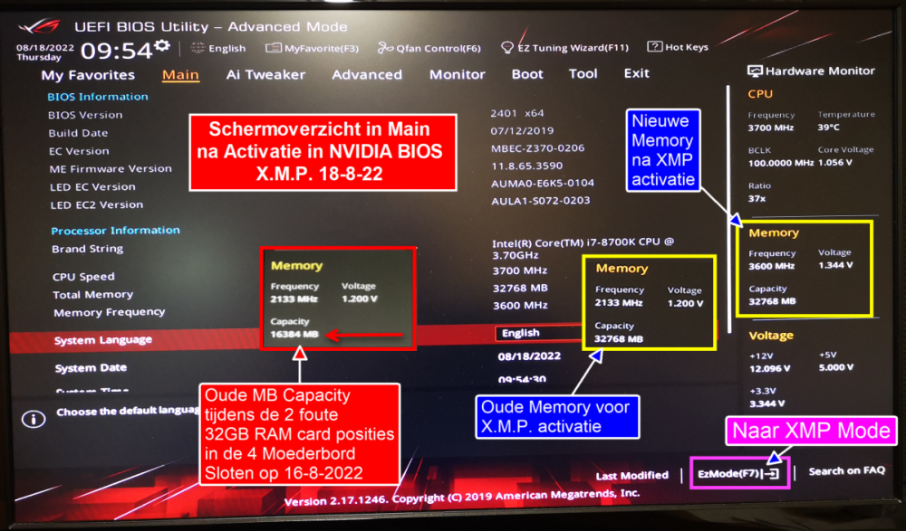 Hallo Passer, dank zij jou oplettendheid in verband met mijn Capacity in Bios Memory heb ik vanmorgen ook de X.M.P. settings gevonden, deze was niet geactiveerd. Na het activeren is de frequentie van 2133 MHz gestegen naar 3600 MHz, dit even om deze Topic voor mij succesvol af te sluiten. 😁 Veel dank aan alle PC Helpforum medewerkers die mij hierbij geholpen hebben.