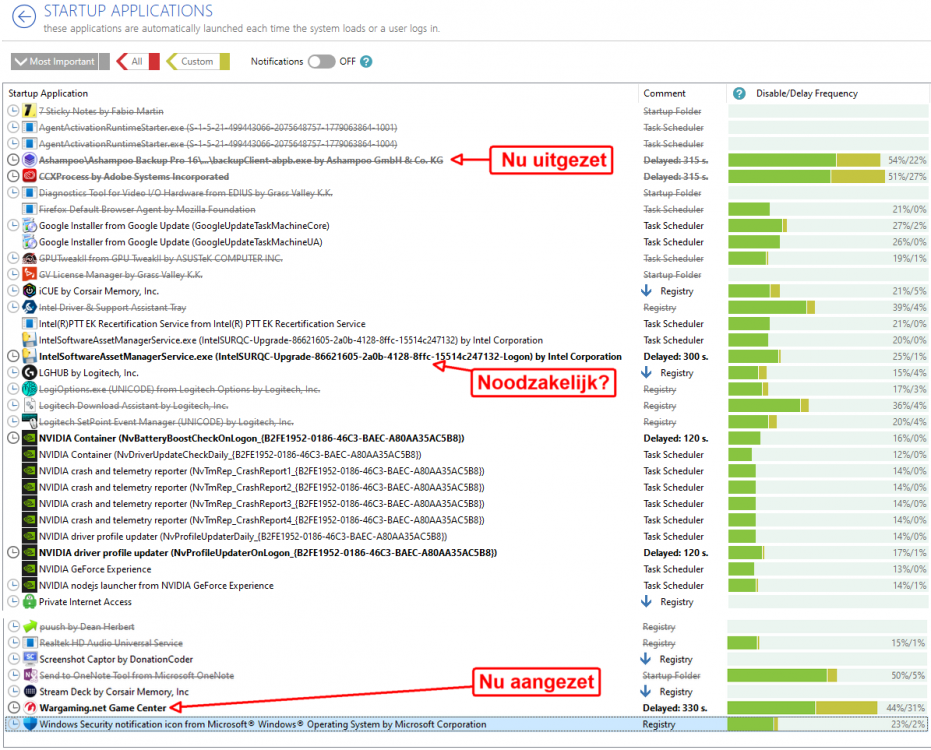 Geachte Heren, bij deze hartelijk bedank voor de opfrissende wenken. Ik heb inderdaad best wel veel programma's die tijdens het opstarten openen verwijderd. Ik ben erg blij dat inmiddels de opstarttijd ongeveer 90 seconden is geworden. >Ik wil graag even weten of het programma hieronder ook gestopt kan worden svp? Intel(R)PTT EK Recertification Service from Intel(R) PTT EK Recertification Service > Ook wil ik graag leren wat en hoe ik iets in de Boot volgorde kan verbeteren alsjeblieft? > Gaarne even advies over alle NVIDIA file die alleen ook opstarten? Groet, James48