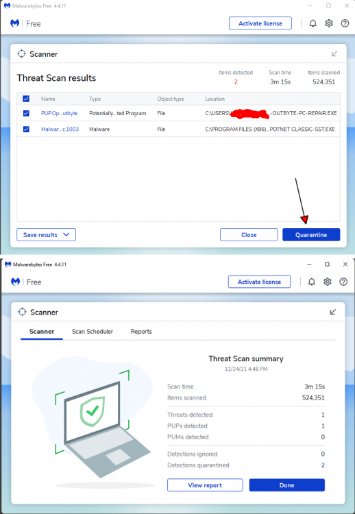 Wel heb ik voor de FRST64 scan, een scan met Malware gemaakt, zoals in de vorige topic aanbevolen werd. Er zijn 2 bedreigingen gevonden, die heb ik in quarantaine gezet.