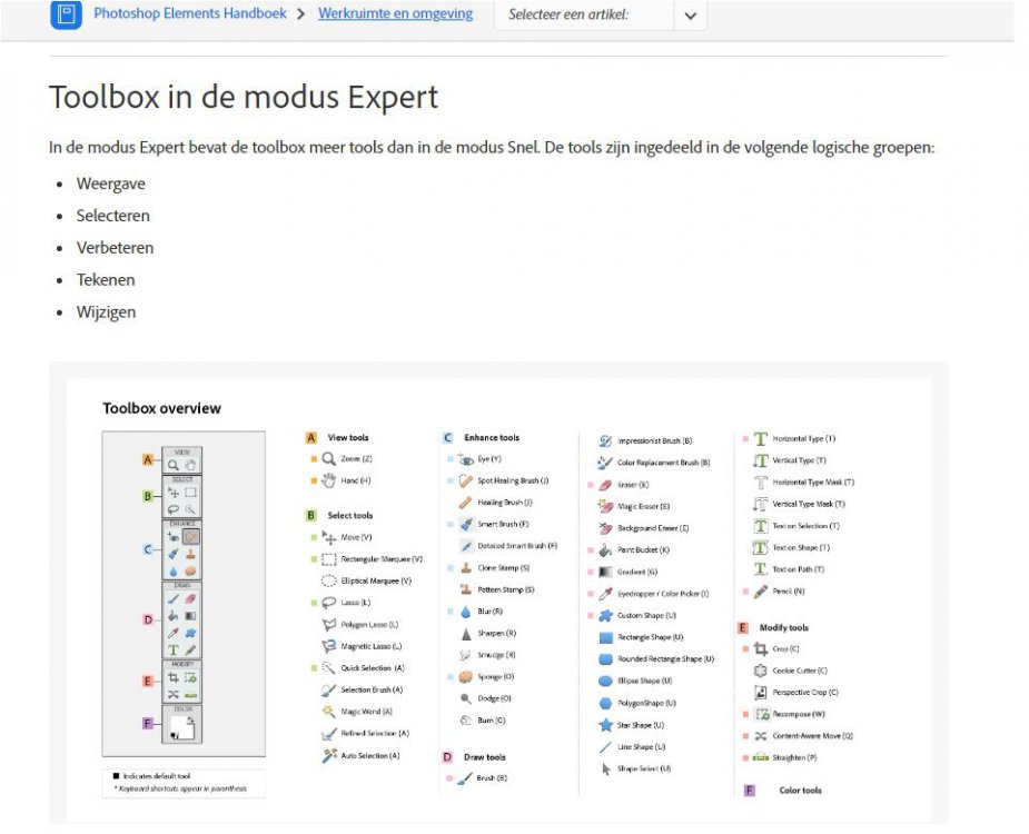 Voor het werk wil ik als extra een korte presentatie maken ivm de uitrol van een nieuw programma. - Printscreens maken van elke handeling Op de Printscreen wil ik een kleine kader plaatsen om functie/ bewerking aan te duiden, en mss een pijl. Kader mag enkel de 4 buitenlijnen omvatten, binnenin doorzichtig. Heb deze functie gezocht op handboek Elements, en zou in de Toolbox in de modus Expert zitten. Hoe kan ik deze modus activeren of kader op een andere manier een kader toevoegen? https://helpx.adobe.com/nl/photoshop-elements/using/tools.html -