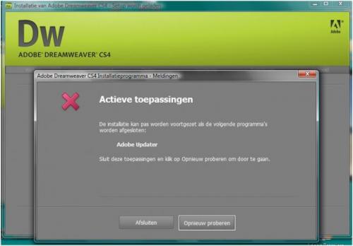 Bij de installatie van dreamweaver CS4 krijg ik volgende foutmelding. "Adobe adpater uitschakelen", zie bijlage. Wat kan hier de oorzaak zijn?
