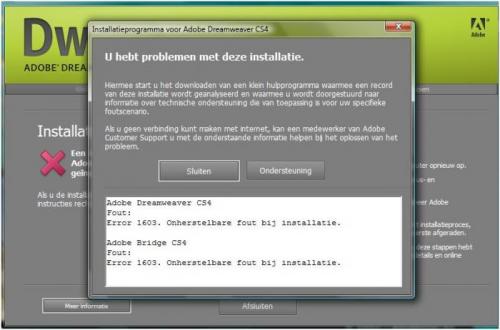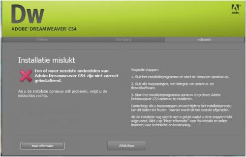 Bedankt voor uw reractie. Terug krijg ik een foutmelding. Mocht het niet lukken dan probeer ik deze te installeren op de desktop. Lijkt me toch bizar dat de installatie niet lukt. Ik zou het liefst dreamweaver installeren op de laptop, omdt deze meer gebruikt wordt. Is er een verklaring voor deze fourmelding?