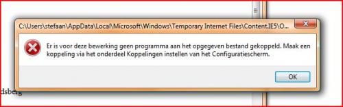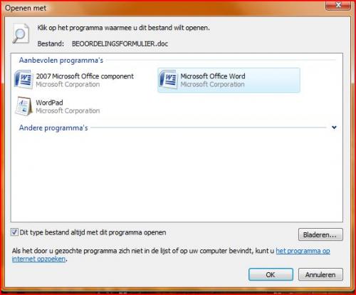 Bij rechter muisknop heb ik 4 mogelijkheden; -openen -afdrukken -opslaan als -alles opslaan Heb geen keuze op te openen met... Momenteel sla ik alles op het buroblad, en open de doc rechtsstreeks. Het is enkel als deze in bijlage zitten van Mail dat het probleem zich stelt. Met de laptop, ook onder Vista heb ik geen probleem, enkel met de desksop. Kan koppelingen niet vinden (fout melding) in configuratiescherm. -