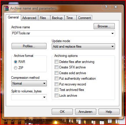 Nog even overlopen, snelkopeling pdf tool staat op buroblad; >rechtermuis knop klikken op icoon en dan heb je de gebruikelijke mogelijkheden, voor ADD heb ik hier 2 mogelijkheden... >>Add tot "PDFTools.rar" --> medling Cannot create PDFTools.rar (dus niet) >>Add to achive --> nieuw vester met de normale mogelijkheden (zie bijlage) maar wat hier moet gebeuren, zie ik niet.... Probeer je nog even, Kape. -