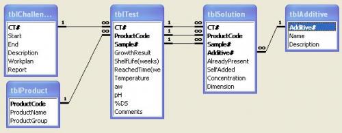2. Dank je voor je antwoord. Ik zou de relaties inderdaad op die manier kunnen veranderen, maar dan krijg ik dubbele sleutels, aangezien in tblTest iedere test (ct) meerdere producten heeft en van ieder product meerdere monsters (samples) genomen wordt. Als ik sample weg zou halen kan er nog maar 1 sample per product ingevoerd worden, terwijl dit er wel 20 moeten kunnen zijn. Enig idee hoe ik van dat probleem af zou kunnen komen? Laat staan het feit dat ieder sample ook weer verschillende toegevoegde stoffen heeft (additieven).