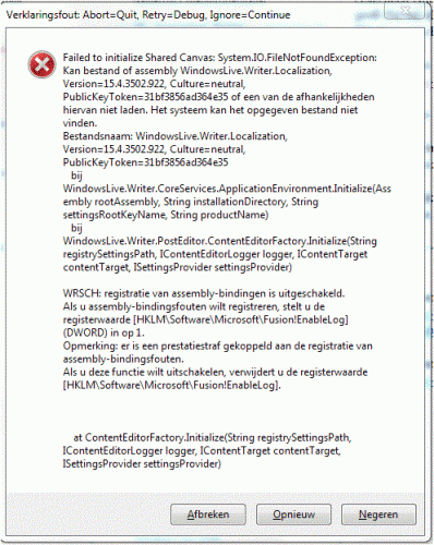 Asus, Clarkie en Kurtt, Hier is een up-to-date van de situatie: Met schrik om het hart heb ik Live Essentials gewist omdat er mij geen andere optie werd gegeven gezien de melding bij het wissen van: probleem met Live essentials, etc. Toen dacht ik alles te moeten her-installeren, maar o-wondere Windows, na het opstarten van Live Mail waren alle instellingen behouden! Op het eerste zicht werkt alles zoals voorheen. Ik heb opnieuw opgestart en de melding blijft (voorlopig) uit. Als het zo blijft verdienen jullie allemaal felecitatie's en omhelzingen van de jury. Hou het nog even open. | Grtn | WW