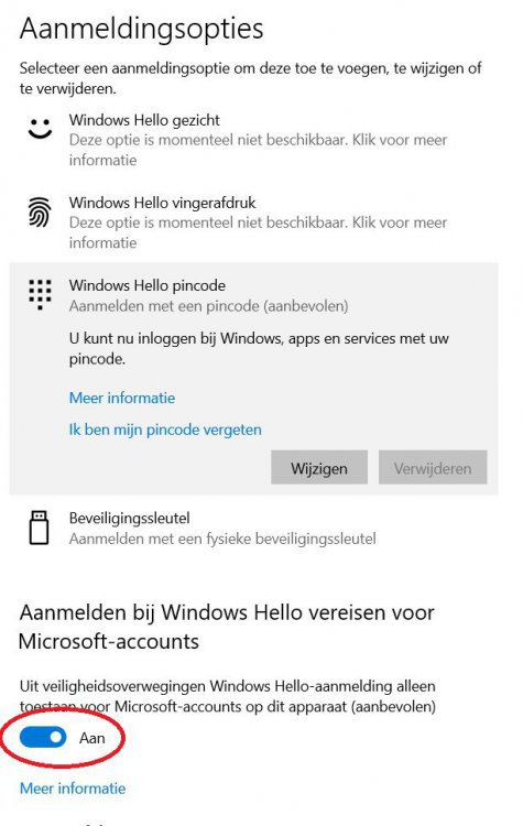 Microsoft paswoord en hello pincode weghalen W10wes45 reageerde op wes45's topic in Archief Windows 10 Beste, Dit heb ik allemaal al geprobeerd. Intussen heb ik de hello pin toch ingesteld want op die manier hoef ik enkel een korte pin in te geven bij opstarten pc. Had ik dit niet of verwijder ik de hello pin dan moet ik telkens bij opstarten pc mijn lang paswoord voor microsoft account ingeven. Trouwens die hello pin kan ik niet zomaar verwijderen. Op mijn scherm kan ik de tap verwijderen niet aanklikken. Daarvoor moet ik eerst de functie "aanmelden bij windows hello vereisen voor microsoft - accounts "op uit zetten. Maar zoals gezegd word terug gevraagd om de microsoft account in te geven. Daaronder ook "wanneer moet een wachtwoord worden vereist" op NOOIT gezet zonder resultaat. Mvg Wes.