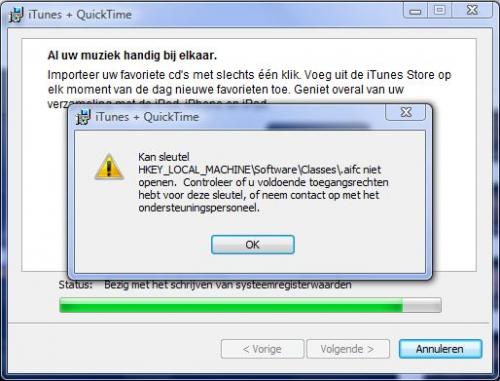 3. Beste lezer Bij het installeren van de laatste Itunes op mijn Acer 5720 Z ondervind ik twee problemen. Probleem 1 Het installeren begint en na enkele seconden komt deze melding. "Er is een probleem met dit Windows Installer-pakket. Een programma dat is vereist voor het voltooien van de installatie, kan niet worden uitgevoerd. Neem contact op met systeemondersteuning of de leverancier van het pakket" Ik heb gewoon op OK geklikt en dat doet hij blijkbaar gewoon verder. Dus dit is misschien niet echt een probleem maar eerder een fout denk ik. Dan wordt er mij om een machtiging gevraagd die ik dan ook geef. (Ik ben ingelogd met administrator rechten) Probleem 2 Itunes installeert verder tot de volgende foutmelding komt. "Kan sleutel HKEY_LOCAL_MACHINE\Software\Classes\aif.niet openen. Controleer of u voldoende toegangsrechten hebt voor deze sleutel, of neem contact op met het ondersteuningspersoneel." Als ik dan op OK klik begint de installatie een terugdraai actie en sluit hij af met de melding dat de installatie voltooid is zij het niet volledig. Ik heb voor dat ik mijn probleem hier plaatste al wat gegoogeld en kwam uiteindelijk hierop terecht. Error 1406 or 1402 appears when you install iTunes or QuickTime for Windows Hierin wordt een stappenplan gegeven hoe dit probleem op te lossen (ik denk toch dat het over dit probleem gaat want ik kan de nummer van de foutmelding niet vinden) Maar bij stap 17 kom ik echter aan een probleem. Ik heb alle stappen doorlopen voor 'OpenWithList' maar het onderdeel 'OpenWithProgram' staat er gewoon niet tussen. Kan er iemand van jullie mij helpen? Alvast hartelijk dank! Andreas