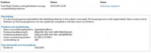 Nee "Total Media Theatre" is niet meer terug te vinden in mijn programma's enkel nog in die melding in "Onderhoudscentrum".. Blijkbaar heeft het te maken met deze twee lijn in die melding : Naam van probleemgebeurtenis: ApphelpHardBlock Probleemhandtekening 01: {f9ab2228-3312-4a73-b6f9-936d70e112ef} Probleemhandtekening 02: {109aca5a-f830-4413-94fc-a26c8850878b}- 8 antwoorden