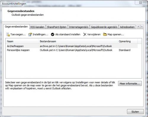 Clarkie, In onderstande mail vindt U de screenshot gemaakt met voormelde link. Het vermelde pad kan ik niet openen. Ik denk dan ook dat het best is de outlook.pst van de recent gemaakte backup van mijn syeteem terug te plaatsen. Ik verlies daar door geen noemswaardige gegevens. - - - Updated - - -- 5 antwoorden